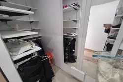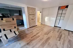 L'appartement se compose d'une entrée desservant un séjour avec cuisine américaine, un couloir avec dressing, deux chambres, une salle de bain et un WC indépendant.