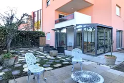 It features a bright 25 m² living room with a fully equipped open-plan kitchen, a cozy bedroom, and a bathroom with a toilet. The real highlight: a 13 m² veranda opening onto a deep terrace and a large private garden of 70 m².