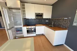 The apartment includes a main living area with an open, fully equipped kitchen, two bedrooms, a shower room, a separate toilet, and a small balcony with unobstructed sea views.