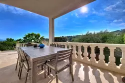 Access to the upper floor is via an elegant staircase. The landing is flooded with natural light thanks to a cathedral-style glass roof, providing exceptional brightness. Upstairs includes three additional bedrooms, one of which is a second master suite, along with three bathrooms and toilets in total. A very large terrace offers a breathtaking view of the sea and valley.